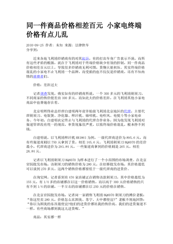 同一件商品價(jià)格相差百元 小家電終端價(jià)格有點(diǎn)兒亂