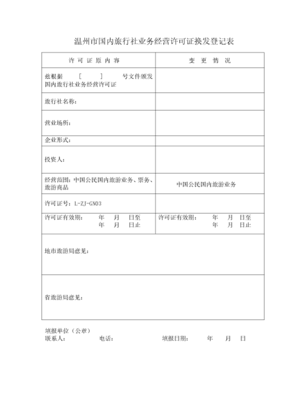 溫州市國內(nèi)旅行社業(yè)務(wù)經(jīng)營許可證換發(fā)登記表
